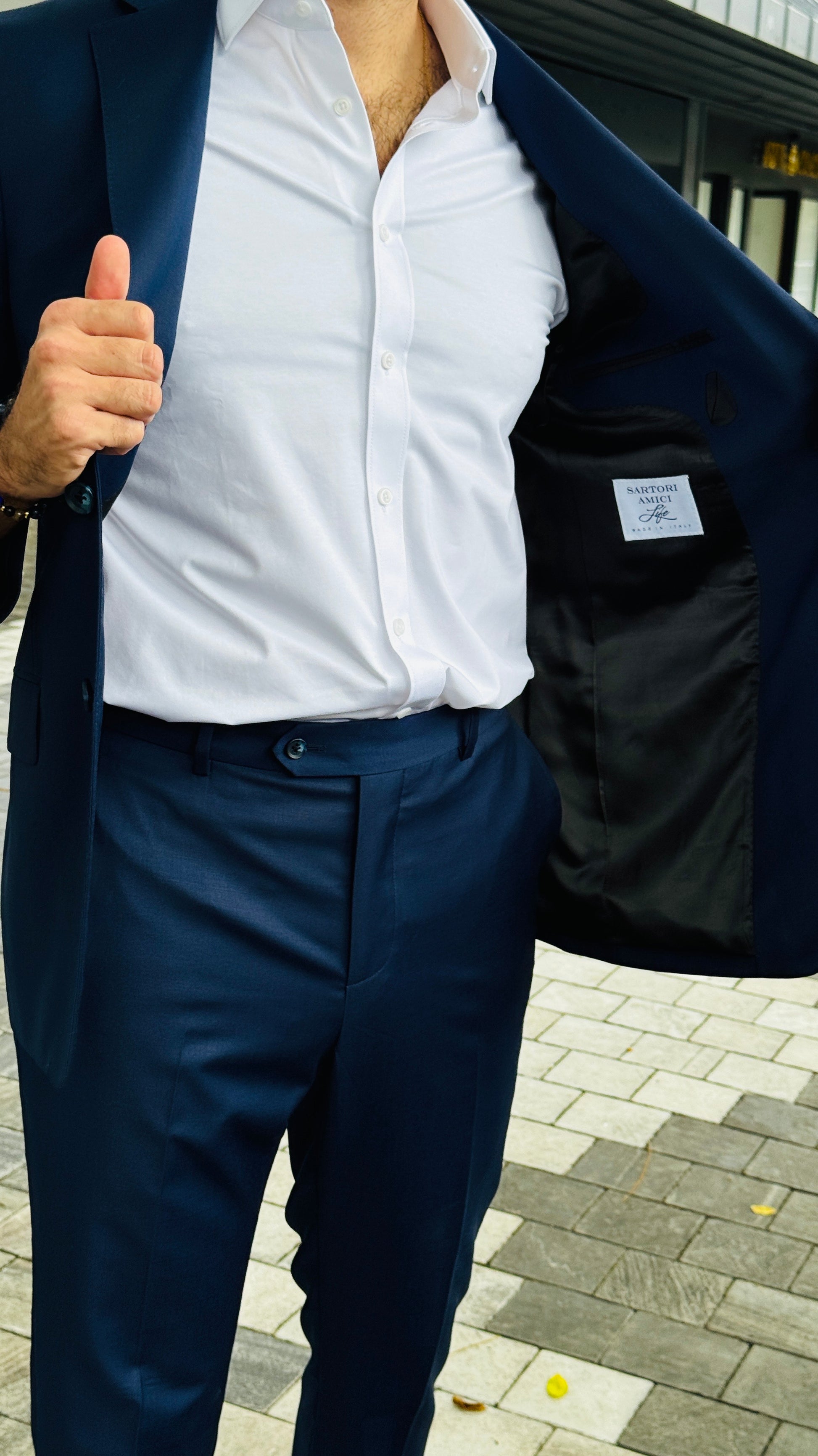 Discover the perfect blend of craftsmanship and modern elegance with our custom-made Navy Notch Lapel Suit, exclusively from the Sartori Amici collection. Tailored from a premium, high-performance fabric, this suit offers a refined look with exceptional comfort, making it ideal for Miami’s lifestyle and year-round wear.