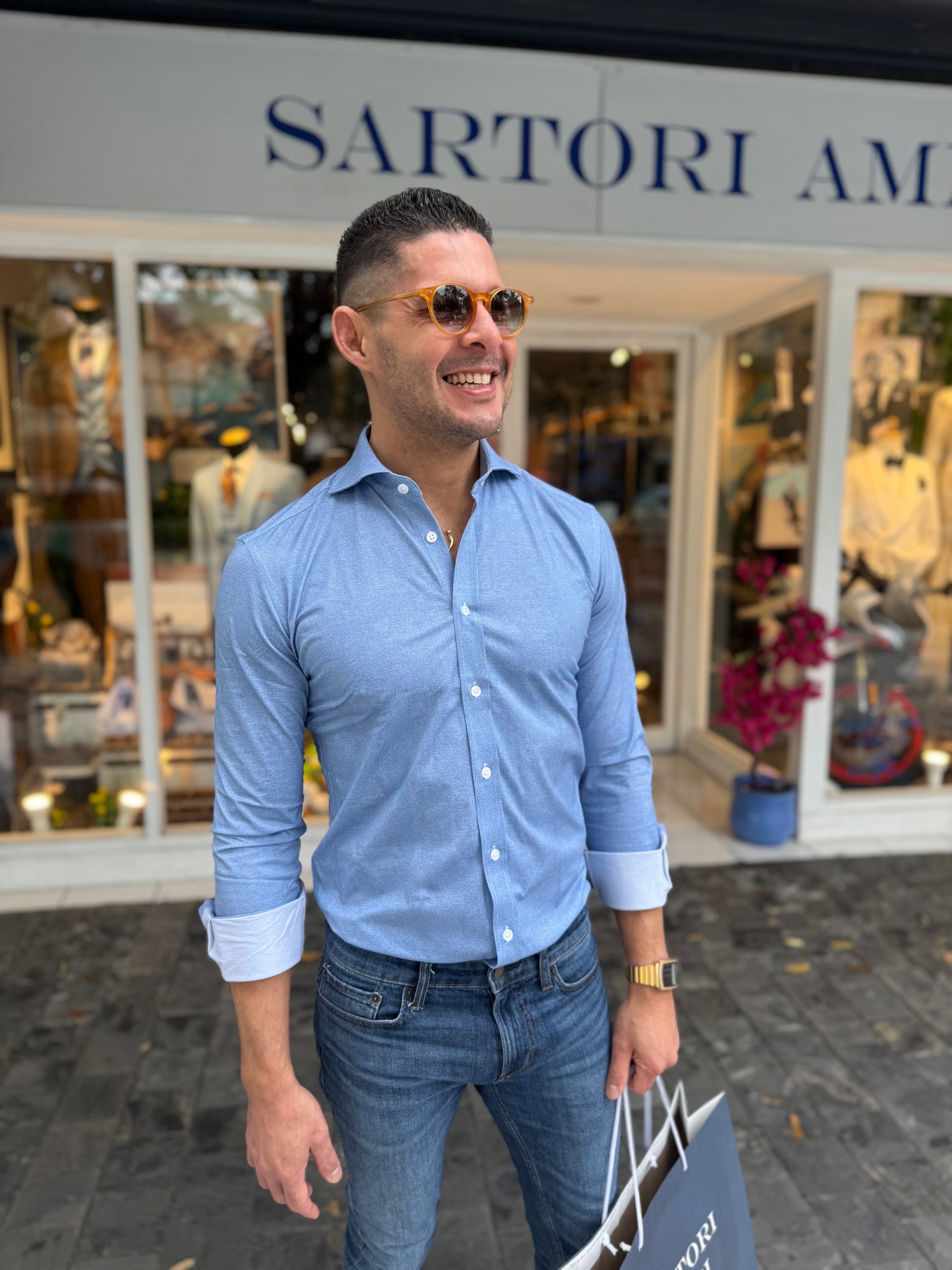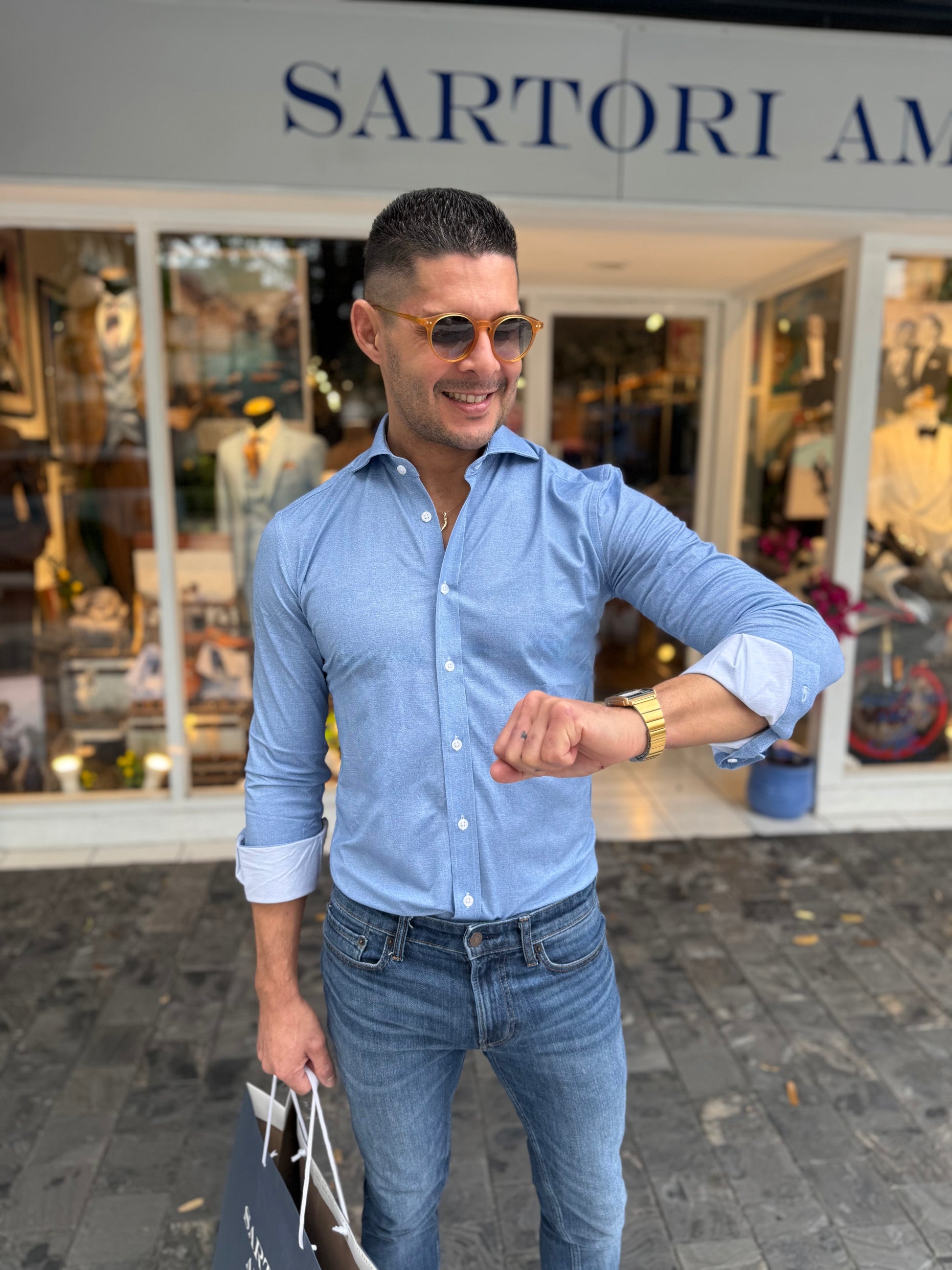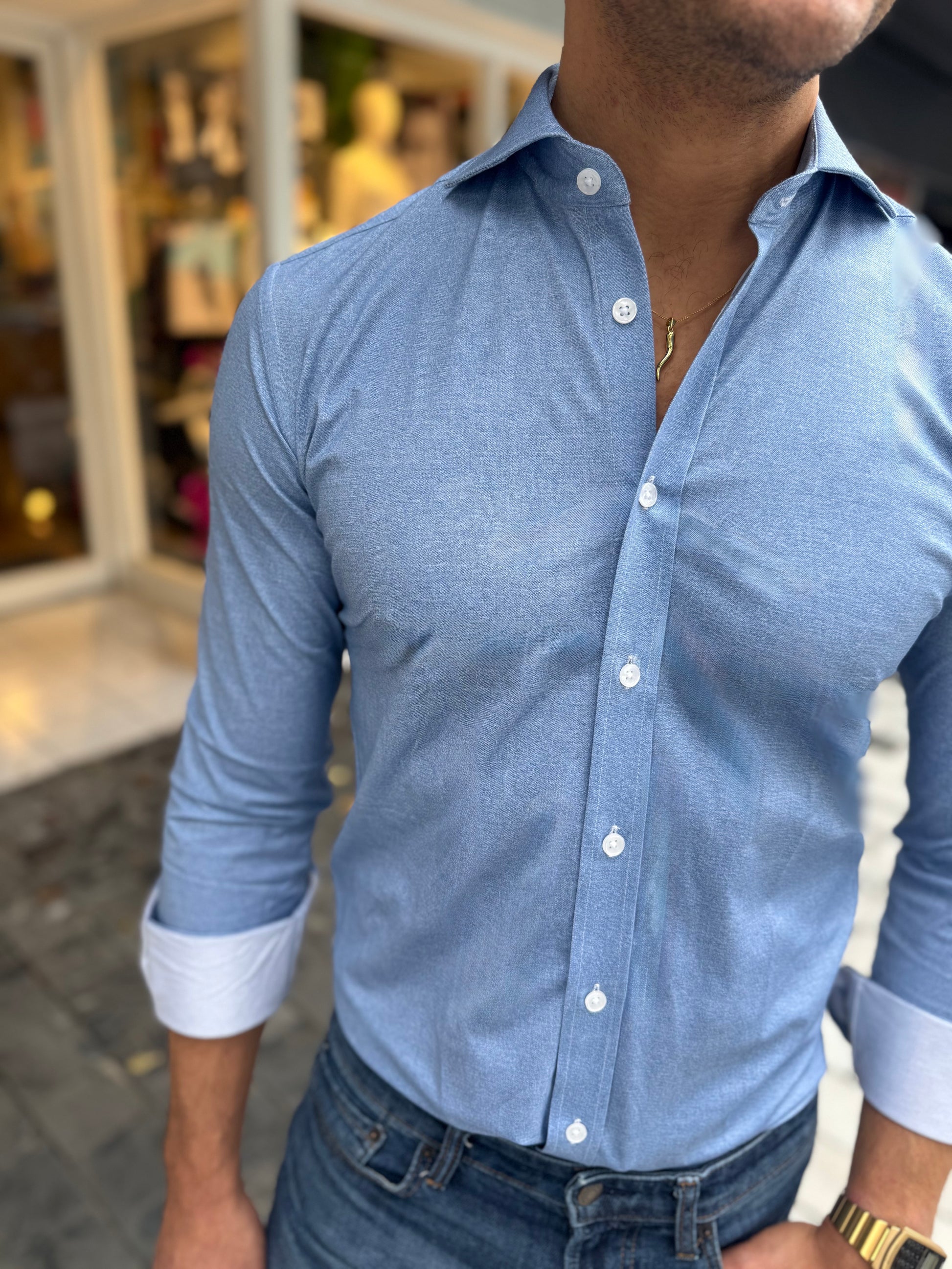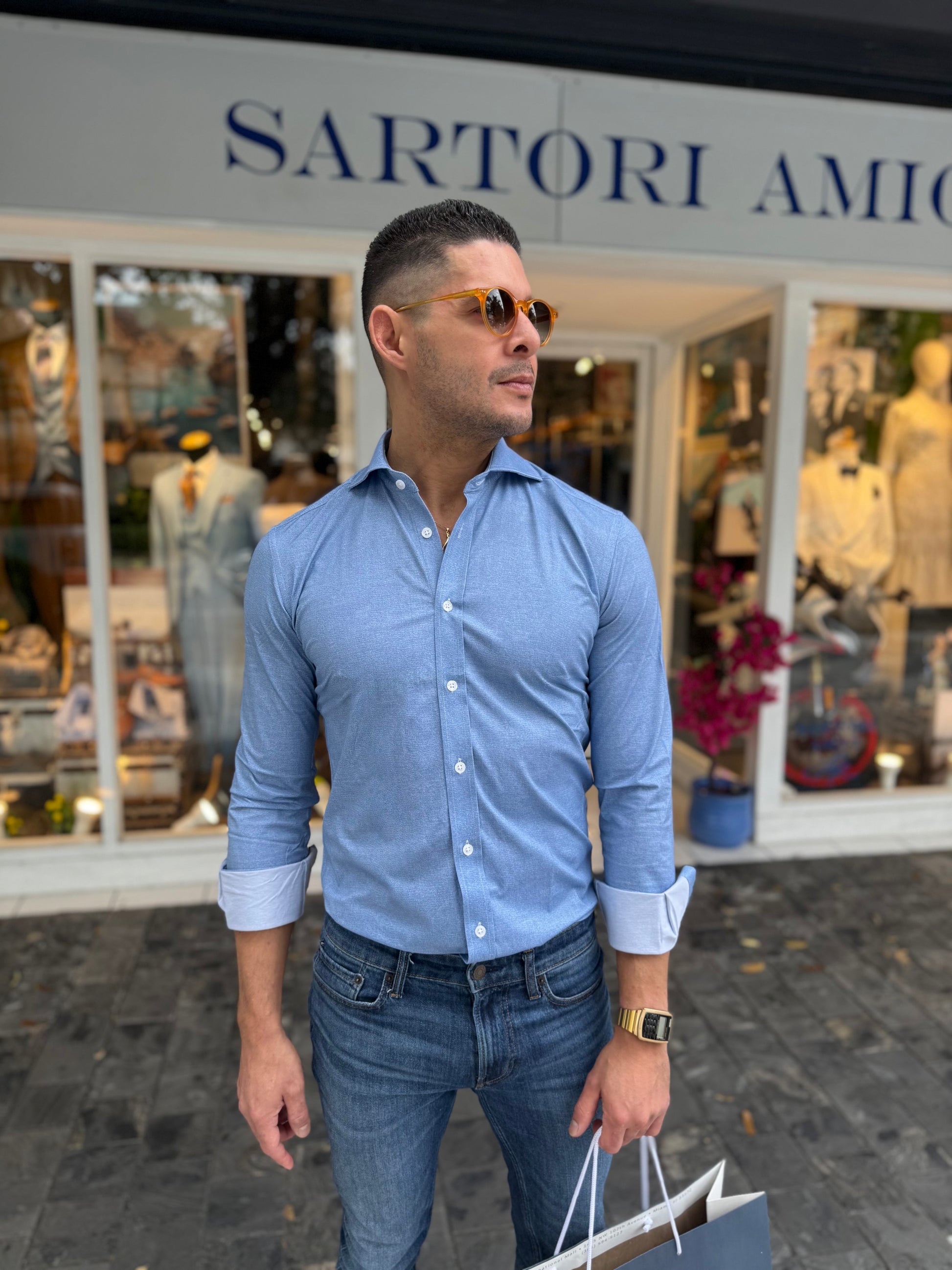 This light blue shirt is crafted from our signature stretch cotton fabric, designed to provide a clean, tailored silhouette while offering exceptional comfort and movement. The texture is smooth with a refined heathered finish, giving depth and elegance to a timeless staple.